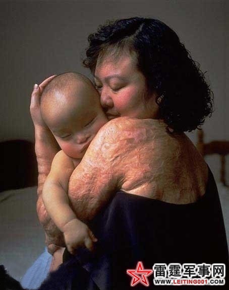 照片显示成年后的潘金淑成了一位普通的母亲,她慈爱的抱着自己的静静睡着的孩子。如果没有潘背后和胳膊大面积恐怖的因烧伤留下的疤痕,这就是一张单纯表现母爱和美好生活的照片。这幅作品是由世界著名摄影大师乔·麦克纳利(Joe McNally)1995年拍摄的。当时乔去寻访这位传奇的女性。最后在加拿大多伦多见到了潘金淑。乔认为,如果像拍摄普通女人一样拍摄潘,那就失去了想要表达的意义。他试图对潘说明了自己的意思,她最终默许了。恰巧她要给儿子托马斯喂奶,于是这样一张暴露战争留下可怕伤疤的背部的女人,慈爱的抱着一个幼小孩子的照片诞生了。