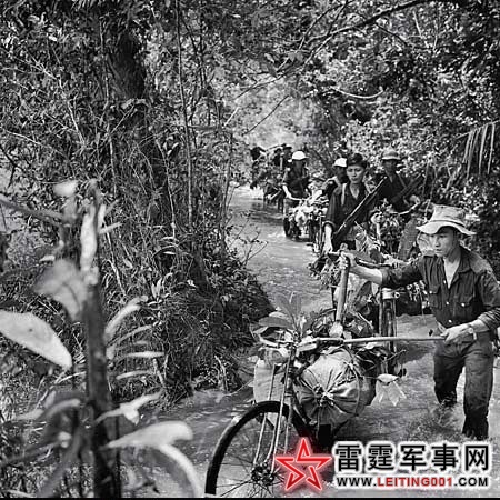 越军记者把“长短筒”对准了胡志明小道上运送给养的”青年志愿者“。(1970)