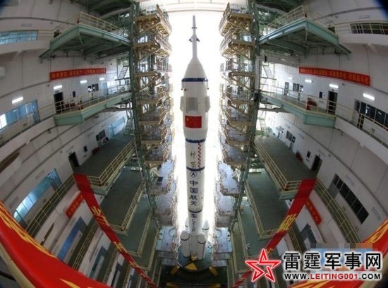 2012年6月9日神舟九号飞船在酒泉卫星发射中心垂直吊装厂房准备完毕,等待转运。