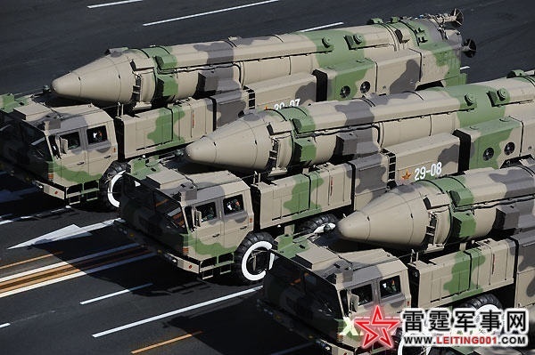 资料图:10月1日,首都各界庆祝中华人民共和国成立60周年大会在北京天安门广场隆重举行。这是某新型中远程地地常规导弹方队在长安街上行进。 新华社记者 李勇摄