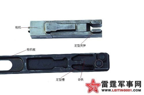 ▲56-1式轻机枪枪机闭锁片下部的定型突笋与枪机框上的击铁、定型槽相配合完成开、闭锁动作