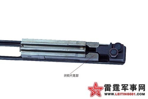 ▲呈闭锁-击发状态的枪机,闭锁片尾部被击铁撑开,枪机框上的击铁撞击到击针尾部,从而使击针头向前打击枪弹底火